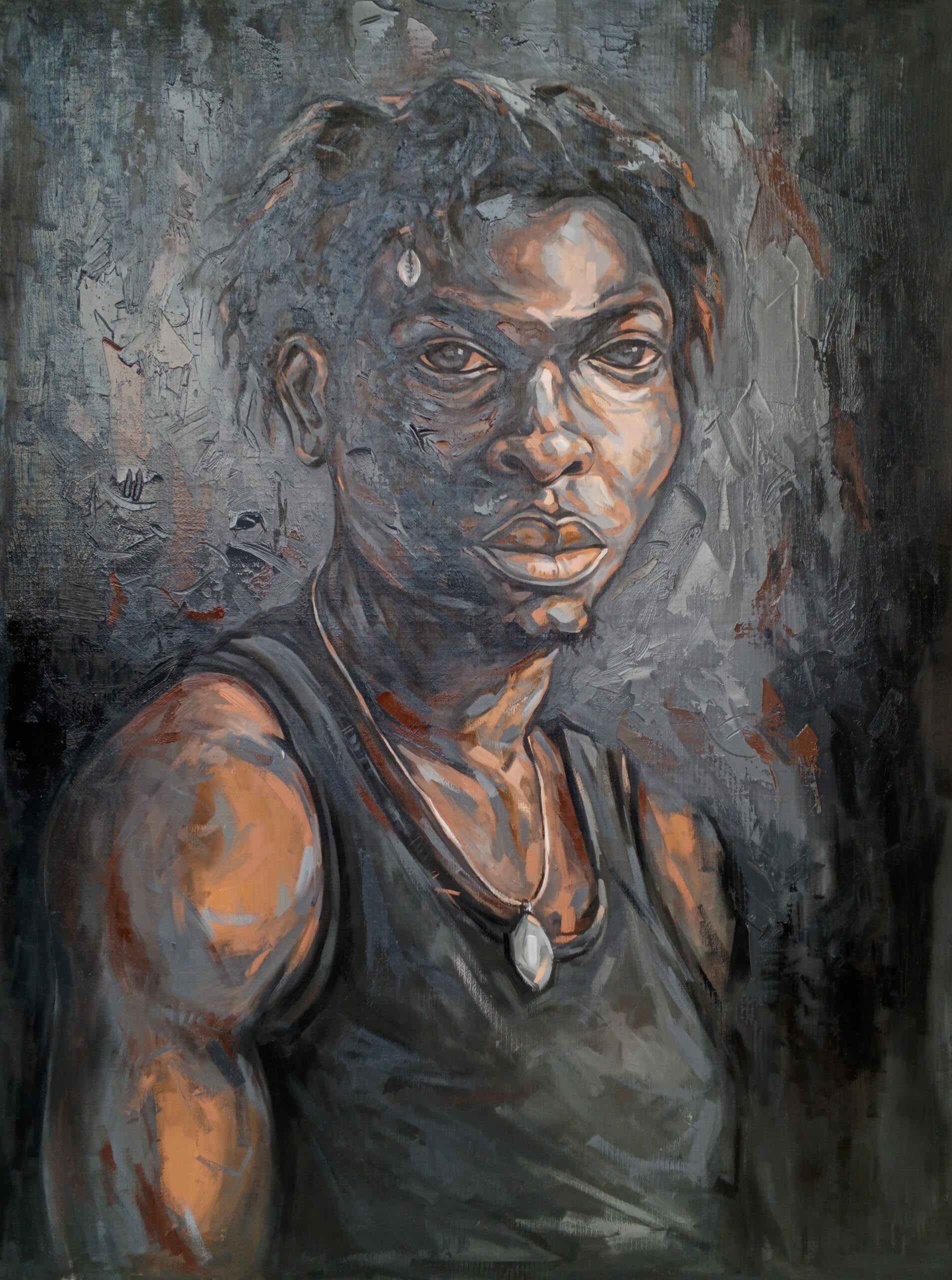 “Resilient” portrays the essence of strength and determination through its subject’s piercing and steadfast gaze. Set against a textured, muted background, the figure radiates an undeniable presence. The artist’s masterful use of earthy tones, bold contrasts, and layered brushstrokes brings out the subject’s emotional depth and humanity. The subtle yet vivid highlights on the skin emphasize the narrative of inner strength, while the pendant around the subject’s neck hints at personal identity and individuality amidst the abstract surroundings.