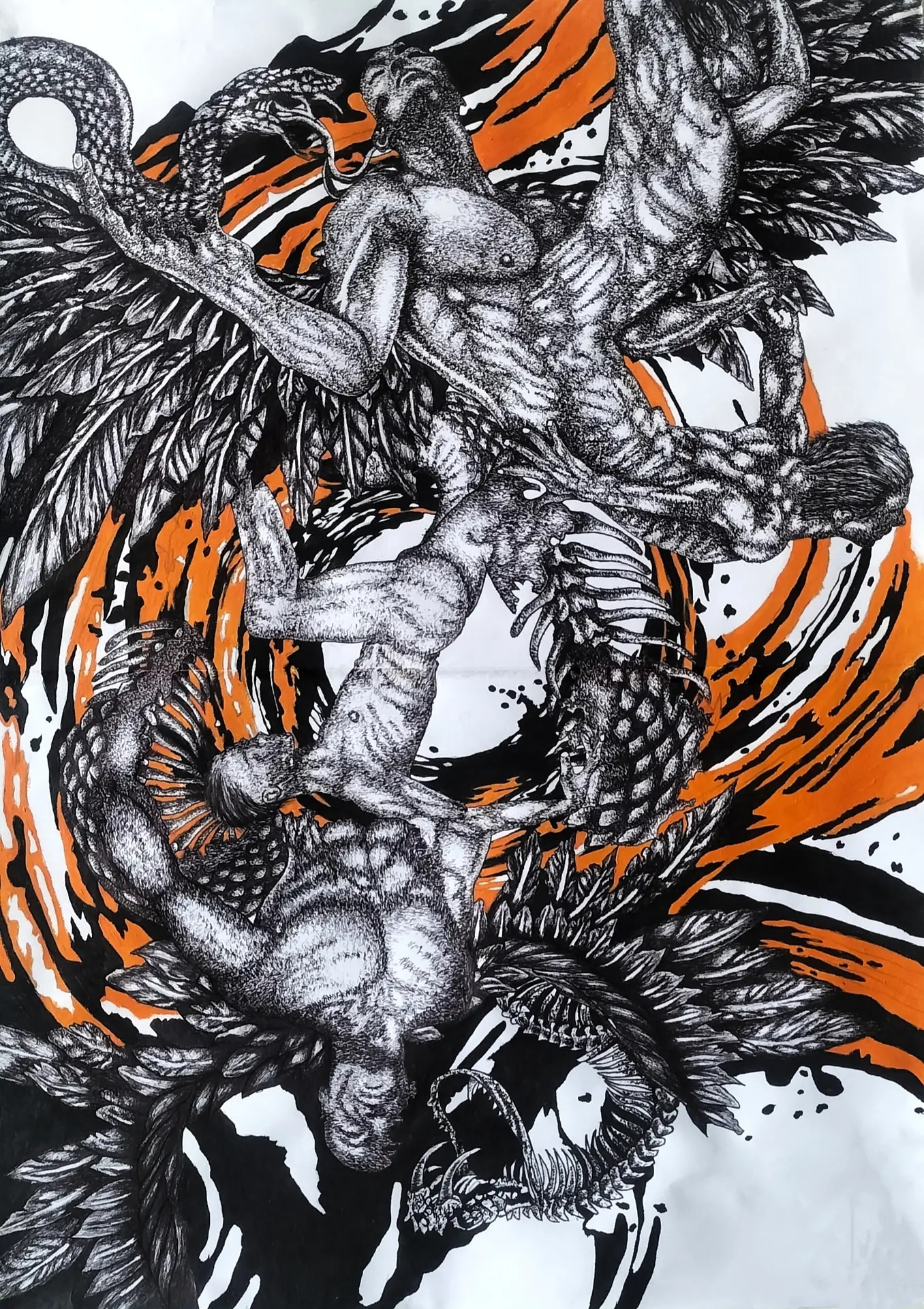 In The Fall of the Morningstar, the viewer is confronted with a visceral, almost mythic rendering of Lucifer’s descent from grace — a moment not only of celestial rebellion but of personal reckoning. This artwork, the inaugural piece of the Sins of Divinity collection, acts as both a symbolic narrative and a reflective mirror. Created using meticulous pointillism layered with oil and ink, the piece ripples with texture and tension. Stark black forms and intense orange bursts draw the eye into a spiral of motion and emotion — illustrating both cosmic downfall and inner collapse.